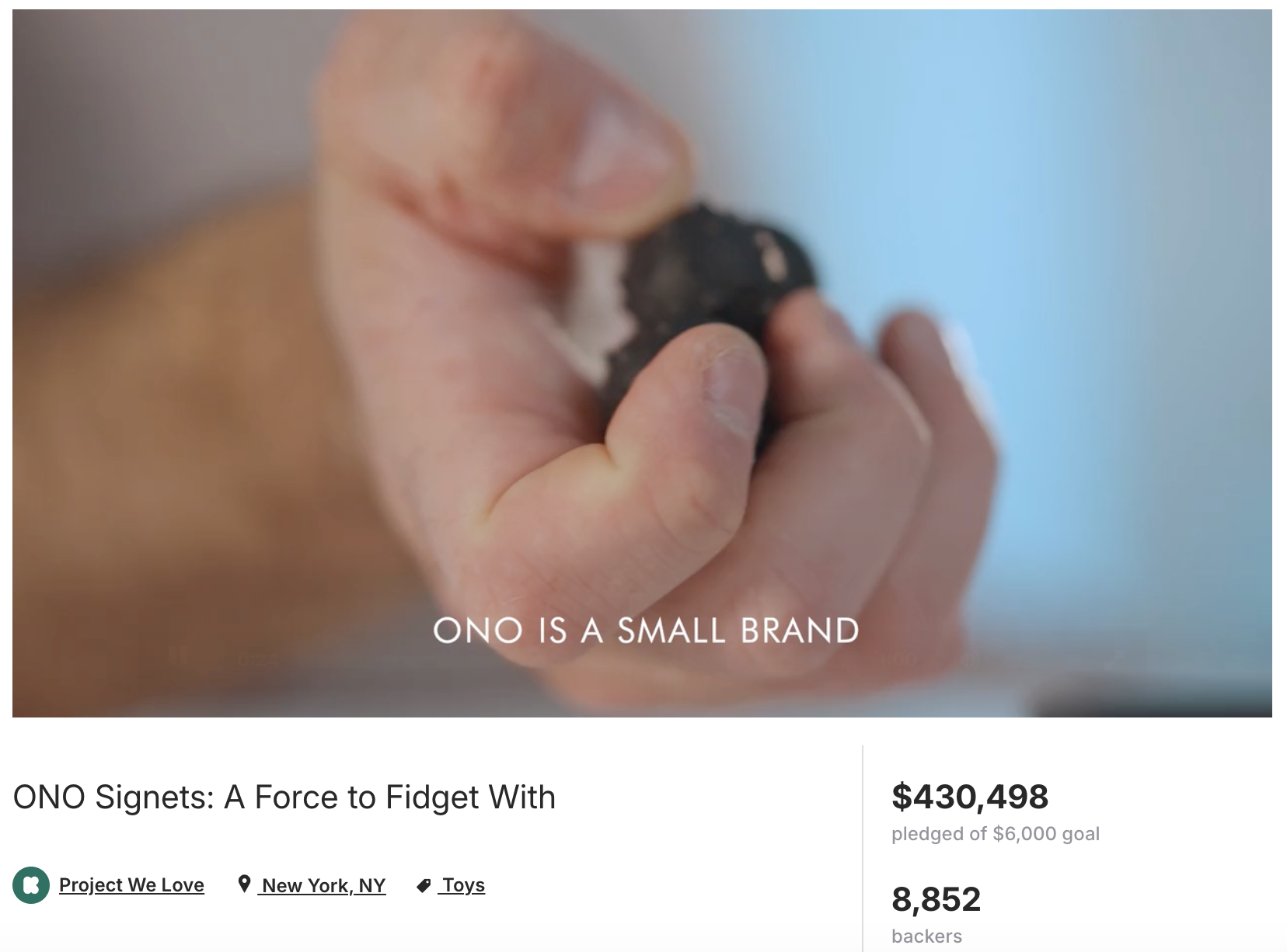 Phonso Studios partnered with Goldin Projects produced the visual campaign for ONO Signets: A Force to Fidget With, a Kickstarter project that exceeded expectations by raising over $430,000+ from more than 8,800 backers — surpassing its funding goal by more than 7,000%. This work helped drive investor, donor, and community engagement through compelling storytelling and high-quality creative content.